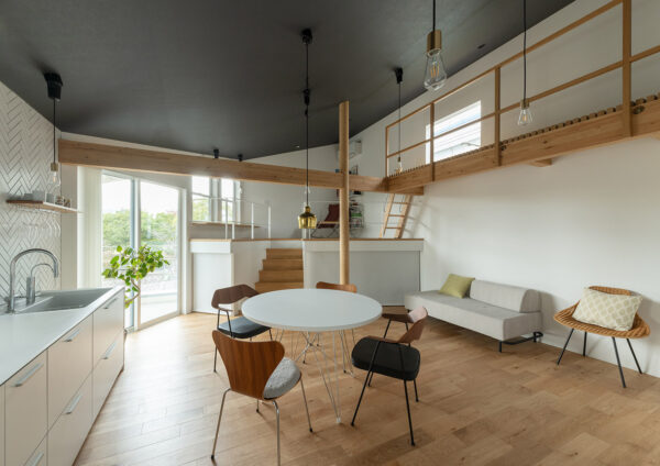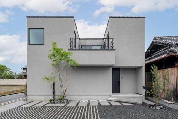 こちらは立方体の箱をモチーフにしたキューブスタイルのお家。1階はロの字型ですが、2階はコの字型と独特のデザインが魅力的です。中庭を建物で囲むことでプライバシーと採光性・開放感を両立しています。室内は外壁と同系色の内壁を基調に、床や家具、建具類には木目、窓枠や階段の手すりをブラックで統一し、スタイリッシュな雰囲気でまとめました。