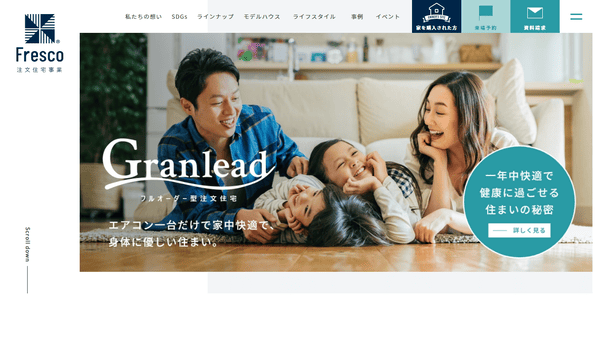 フレスコのフルオーダー型注文住宅「Granlead(グランリード)」は、エアコン1台で家中快適に過ごせる心をからだに優しい住まいです。温園環境や空気環境、ライフサイクルコスト、家族の安心・安全、建築としても意匠の5つのデザインを実現しています。家族の毎日の暮らしや子どもたちの成長を応援するために最適な住まい探しや住まいづくりを提案している住宅会社です。