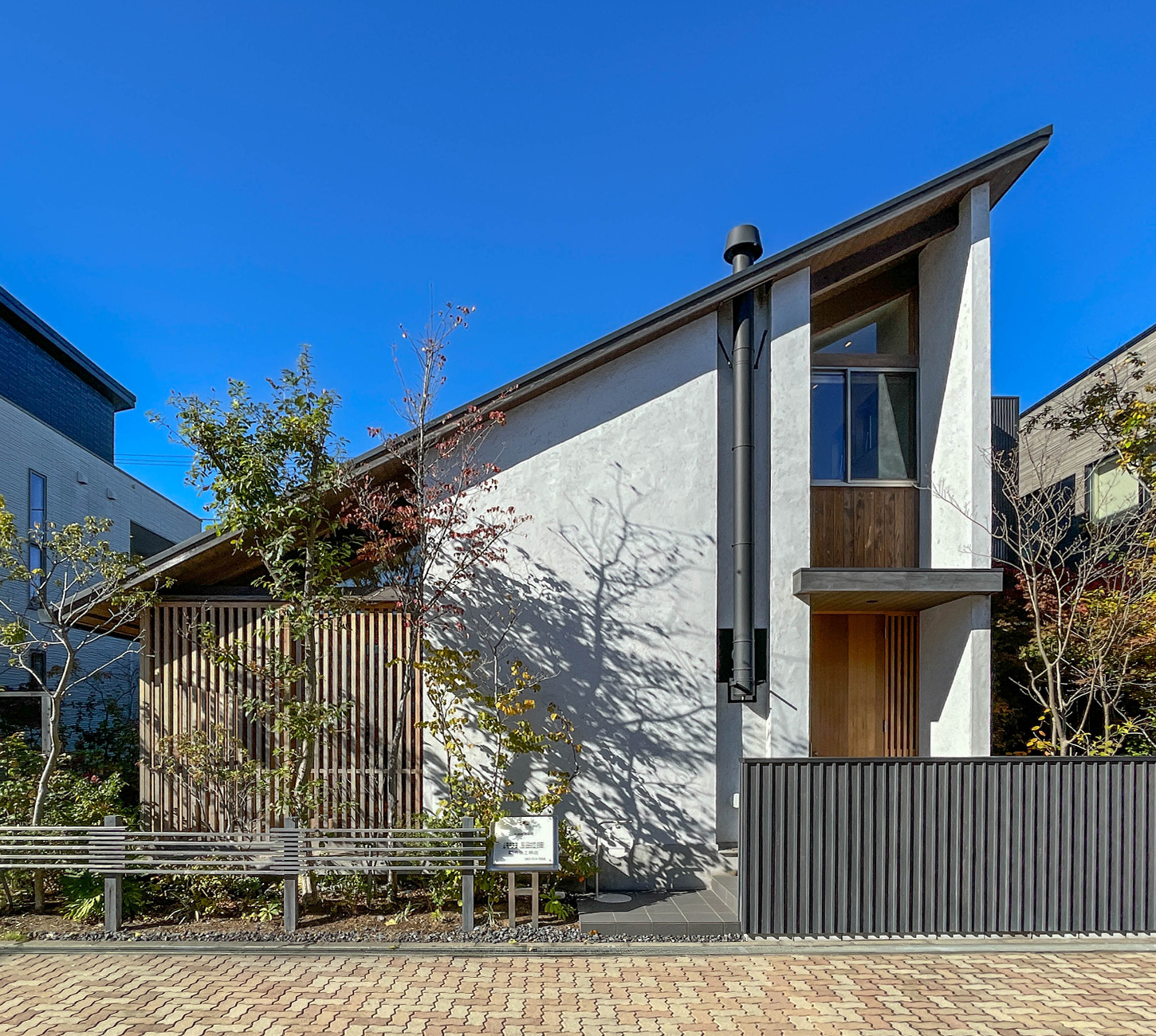 三角屋根が特徴的な二世帯住宅。家族がゆったりくつろぐことができるLDKは、キッチンを中心とした回遊性が特徴。杉板を使用することによって、優しい温もりが感じられる雰囲気となっています。両親世帯と子世帯は、広い縁側が繋いでいることに加え、浴室やトイレなどは将来の生活を視野に入れて考えられている点も間取りのポイントです。